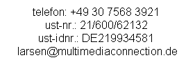Die hier angegebenen Kontaktdaten sind ausschließlich zur Kontaktaufnahme gedacht. Einer Aufnahme in Verzeichnisse und Datenbanken wird ausdrücklich widersprochen und kostenpflichtig angezeigt.